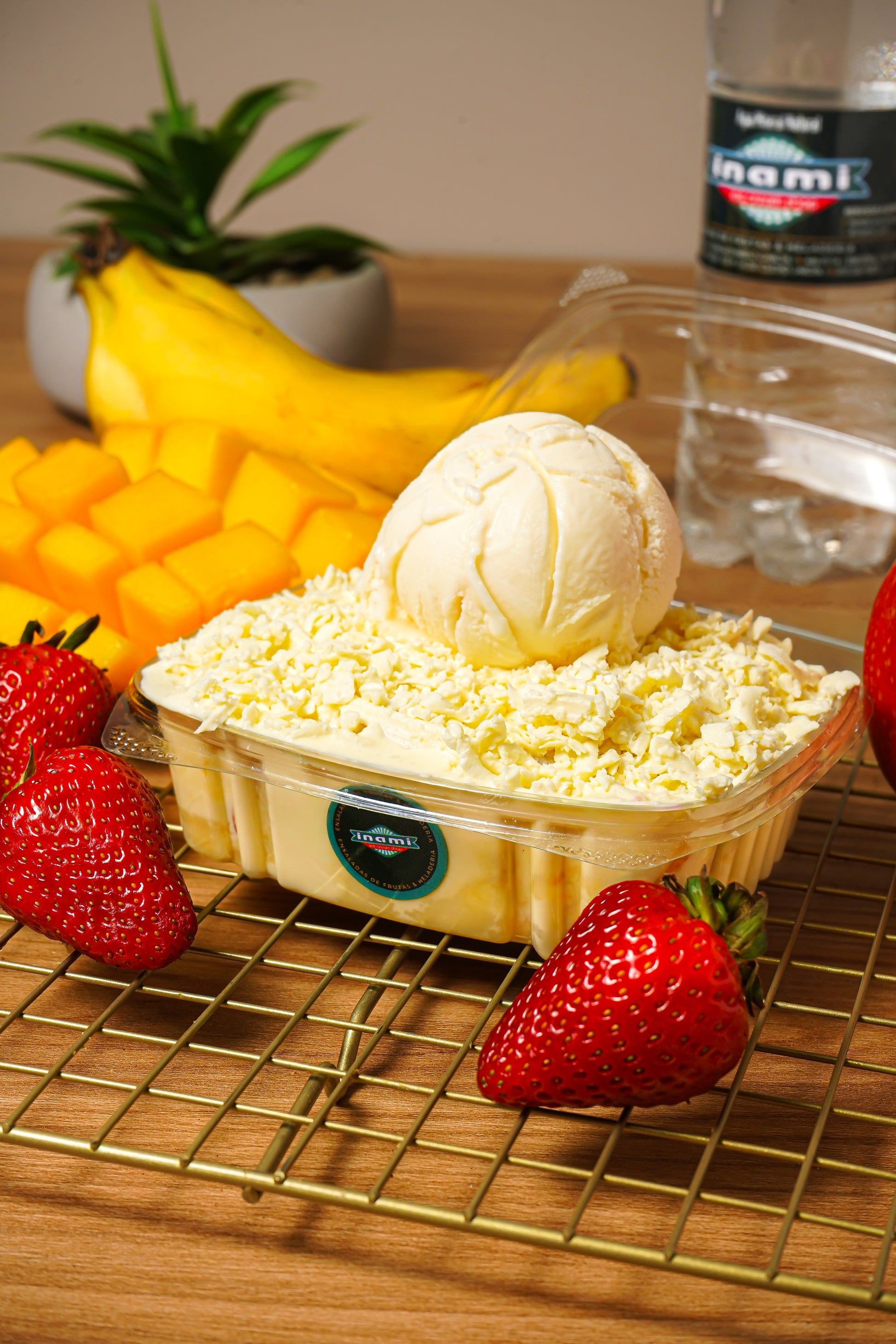 Banano, mango, fresa, manzana, piña calada, crema de leche, leche condensada, queso y helado. (1 sabor)